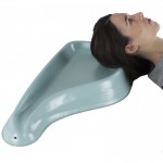Este lavacabezas, de diseño ergonómico y fabricado en una sola pieza, dispone de bordes elevados que permiten lavar el cabello en la cama.  Dispone de un extremo más afinado que permite evacuar el agua sobre un cubo por una ranura fuera de la cama.
